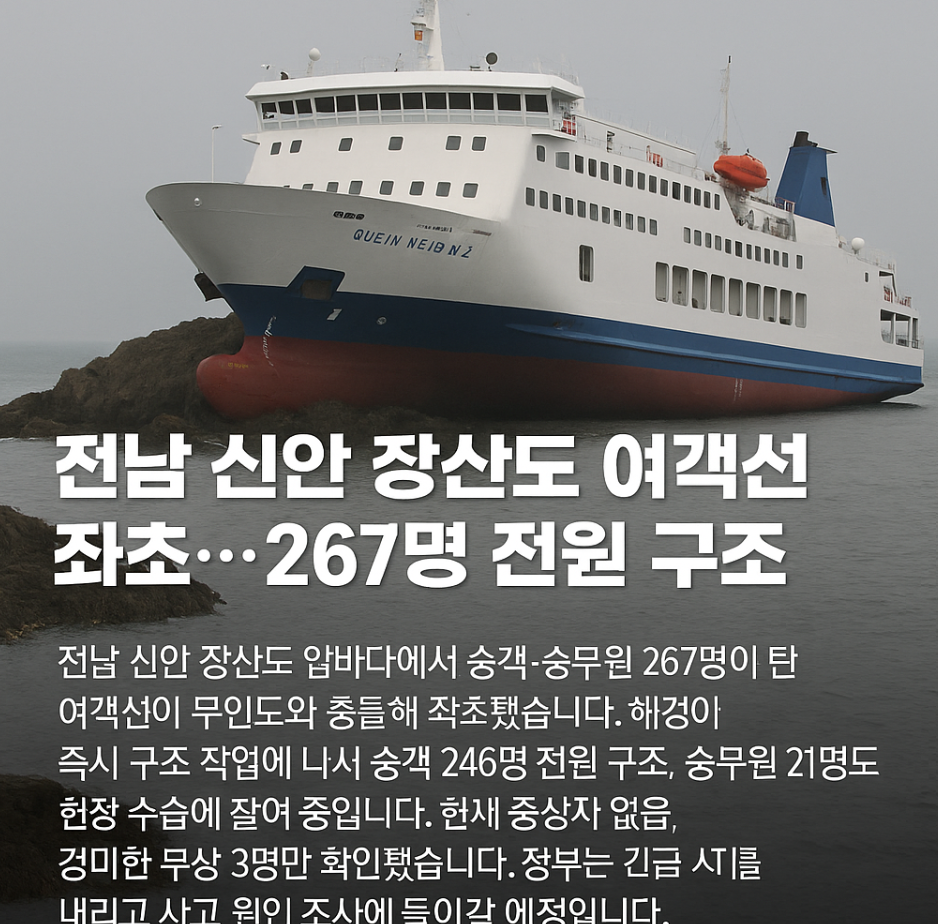 전남 신안군 장산도 근처 해상에서 승객과 승무원 267명이 타고 있던 여객선이 무인도인 족도에 충돌해 좌초됐습니다. 선체 내부가 크게 파손될 정도로 충격이 컸지만, 해경과 인근 어선들이 즉시 구조에 나서 탑승자 전원이 구조되었습니다. 현재까지 큰 인명 피해는 없는 것으로 알려졌습니다.